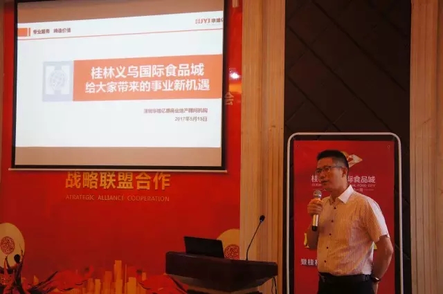 最后,桂林義烏食品城戰(zhàn)略顧問機構深圳華錦億爵商業(yè)地產顧問機構謝金杏先生就桂林義烏國際食品城將給大家?guī)硎裁礃拥氖聵I(yè)新機遇展開發(fā)言,謝總分別闡述了食品城的項目定位、桂林食品百貨行業(yè)批發(fā)市場現(xiàn)狀、項目商業(yè)規(guī)劃、運營模式、以及項目將給大家?guī)硎裁礄C遇五個要點展開。重點闡述了作為商家進駐義烏食品城的長期收益。最后謝金杏先生表示在食品城、行業(yè)協(xié)會、顧問機構、VIP商戶的共同努力下,把桂林義烏國際食品城打造為桂林市顛覆傳統(tǒng)規(guī)模最大的食品百貨批發(fā)大市場。
