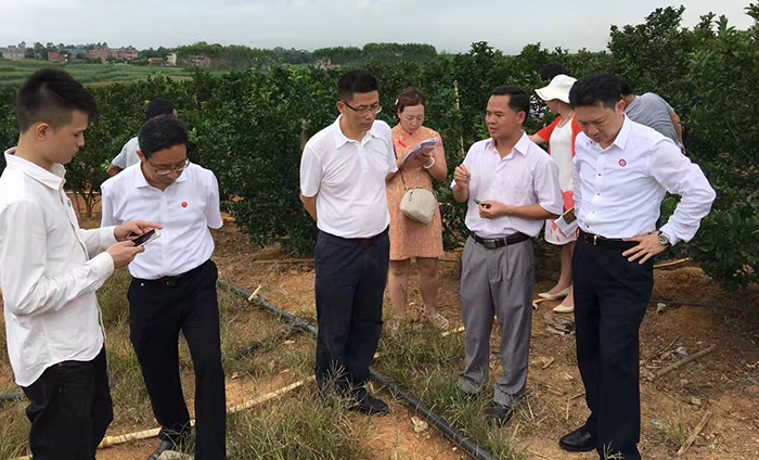 (深圳華錦億爵商業(yè)地產(chǎn)顧問機(jī)構(gòu)總策劃師謝金杏先生(左三)、國家行政學(xué)院政府經(jīng)濟(jì)研究中心副主任研究員、好易農(nóng)科技有限公司董事長(zhǎng)張?jiān)觳┦浚ㄓ乙唬钊胝{(diào)研貴港市種植業(yè)發(fā)展情況)