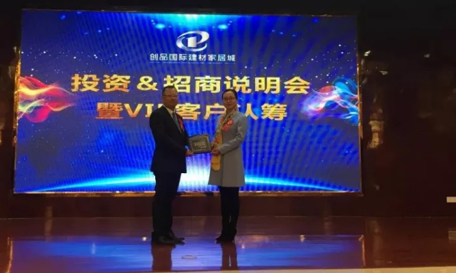 隨后,中國建筑材料協(xié)會秘書長張彩虹女士從國內(nèi)建材家居專業(yè)市場的發(fā)展趨勢角度,給予創(chuàng)品國際的品牌理念和運作模式給予了高度的肯定和贊賞。張彩虹女士代表中國建筑材料協(xié)會將創(chuàng)品國際吸納成“常務理事單位”,并現(xiàn)場授牌。